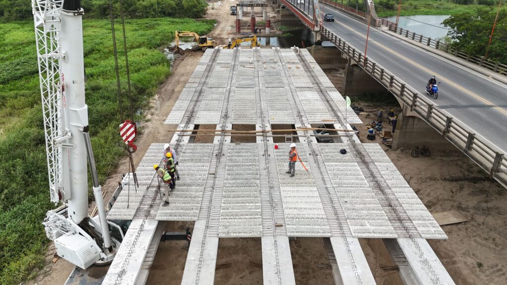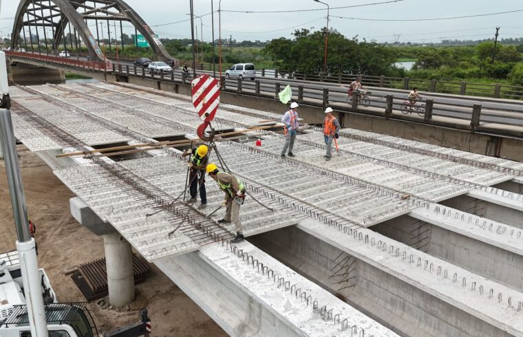 El nuevo puente provincial, ya alcanza un 30 % de avance, con 15 vigas colocadas, que completan 3 vanos, y sobre los que se están colocando las prelosas.